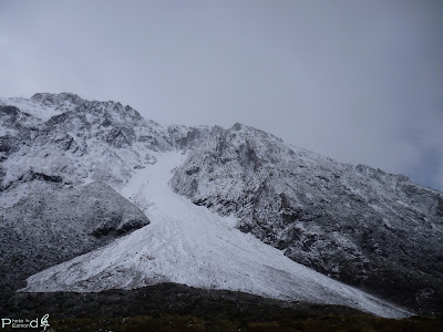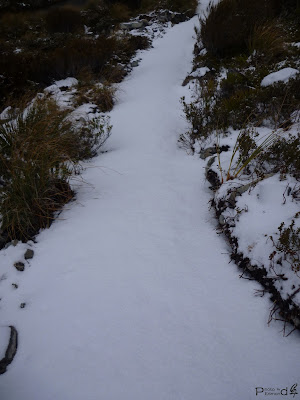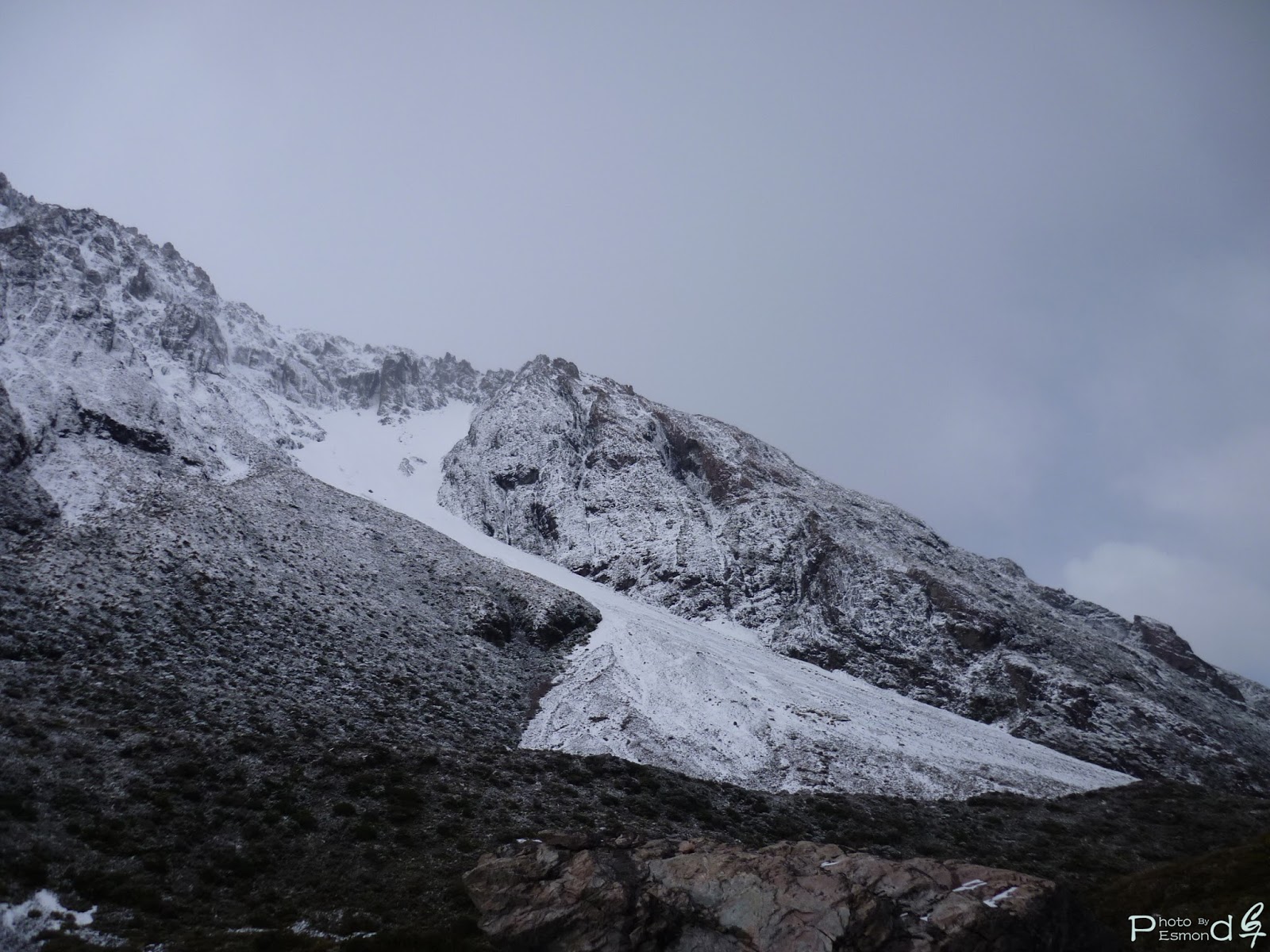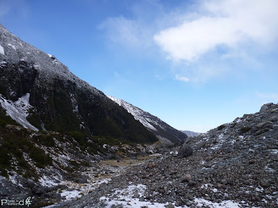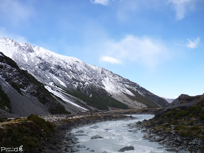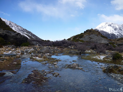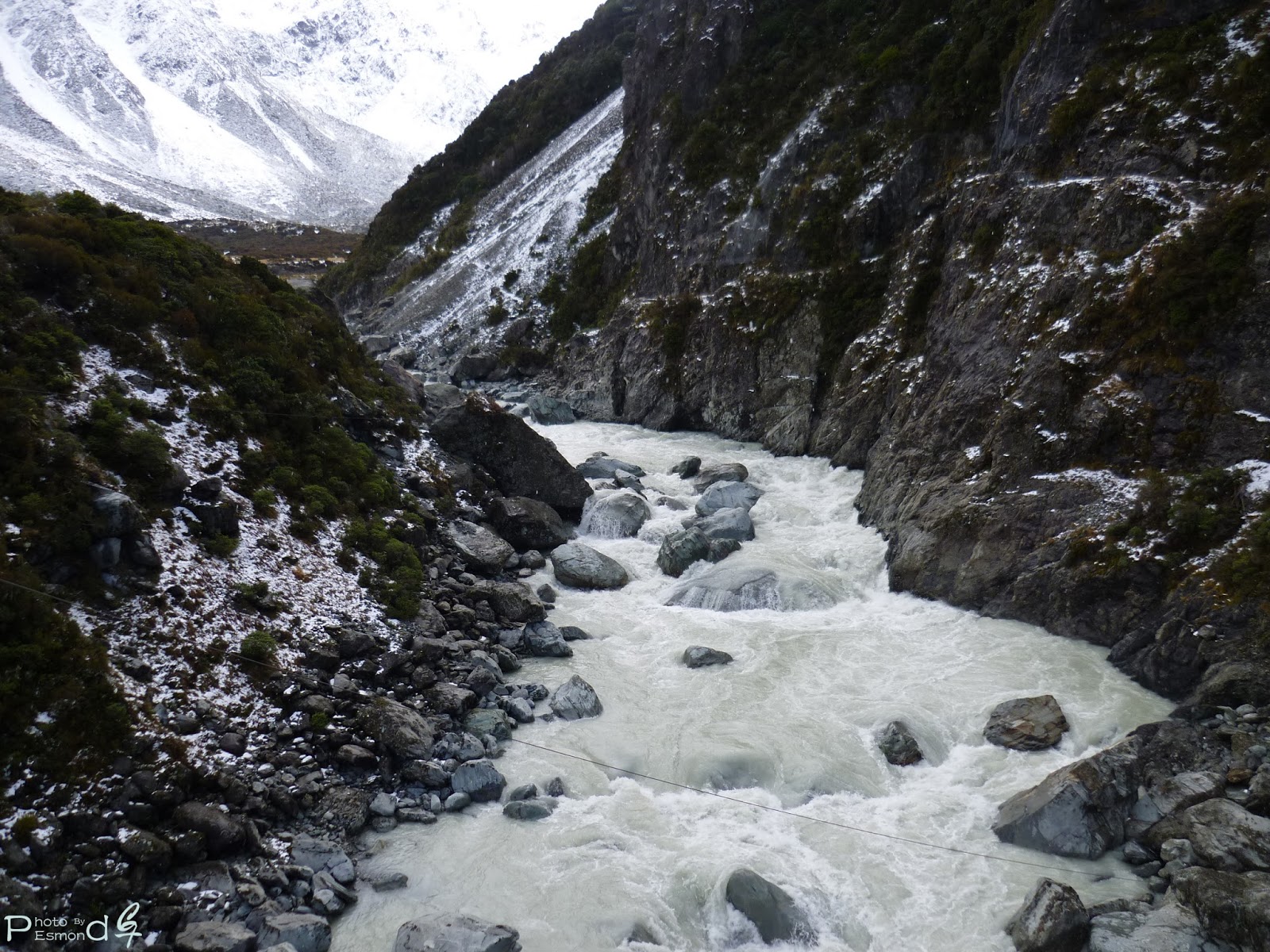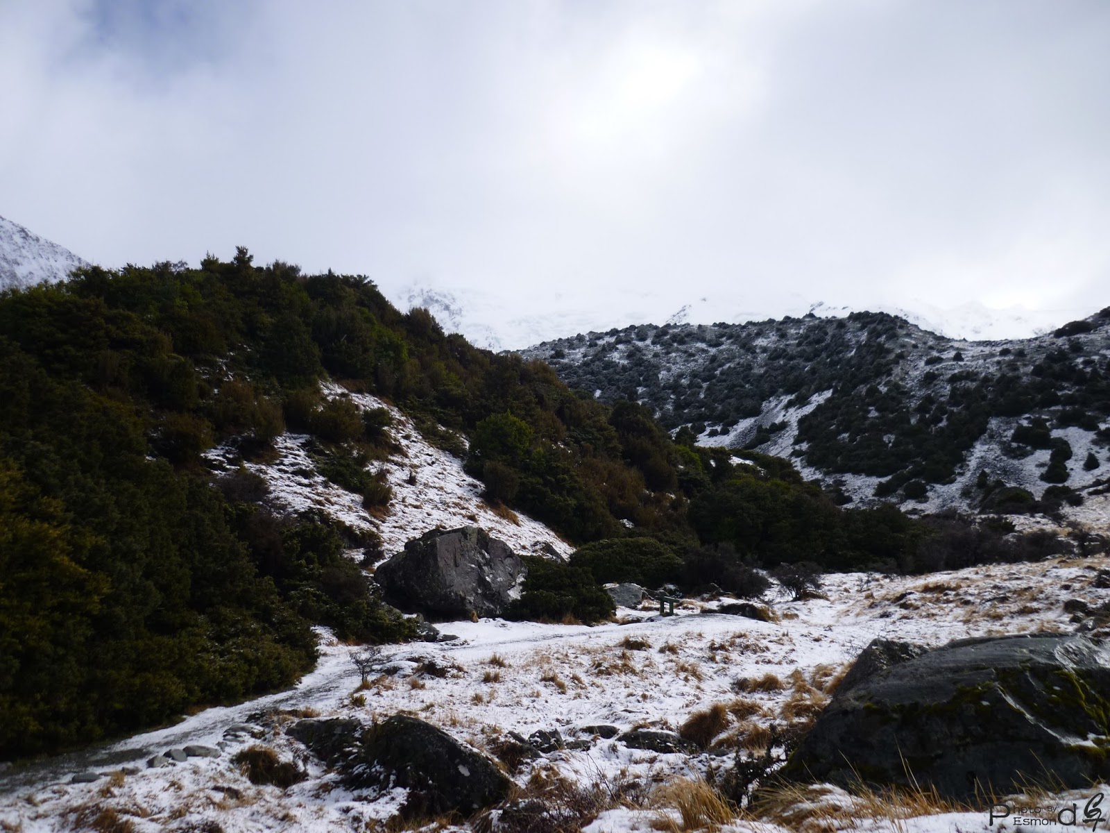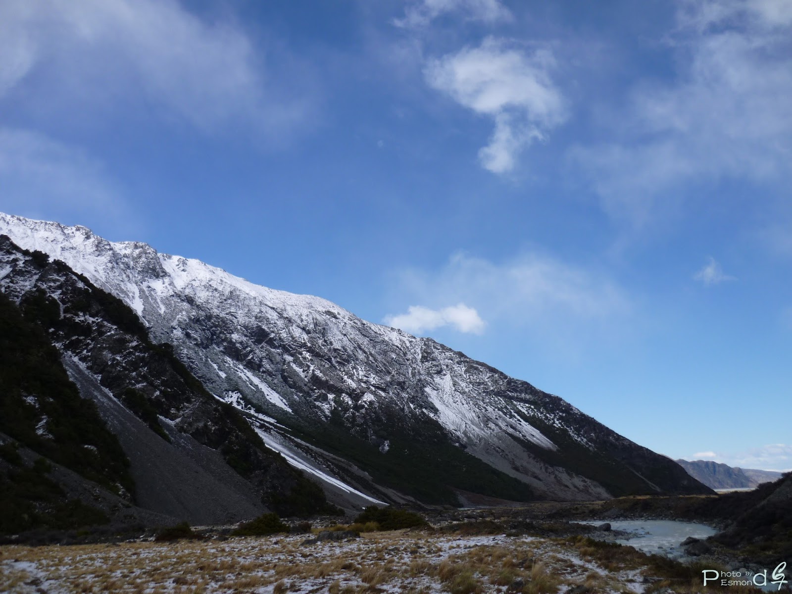 虽然下了雪后的景色真的很漂亮,但也因为之前的坏天气,Hooker Valley Track的步道难度提升了。根据之前有走过相同步道的Ruth姐说,现在我们看到的小溪,很多之前都是步道,但因为连日的大雨和下雪,现在步道都成了小溪。由于部分步道都成了小溪,如果不想弄湿鞋子的旅客就必须尽可能的找到较高的地方来越过这段步道。我们曾经因为真的走不到一条可行的路径而差点放弃啊。。。最后,我们当然是找到了一条可以不弄湿鞋子而前进的路径,哈哈,这些都难不倒我们的!!!过了这段步道,后面的步道就没有遇上类似步道变成小溪的难题了。好了,继续前进。