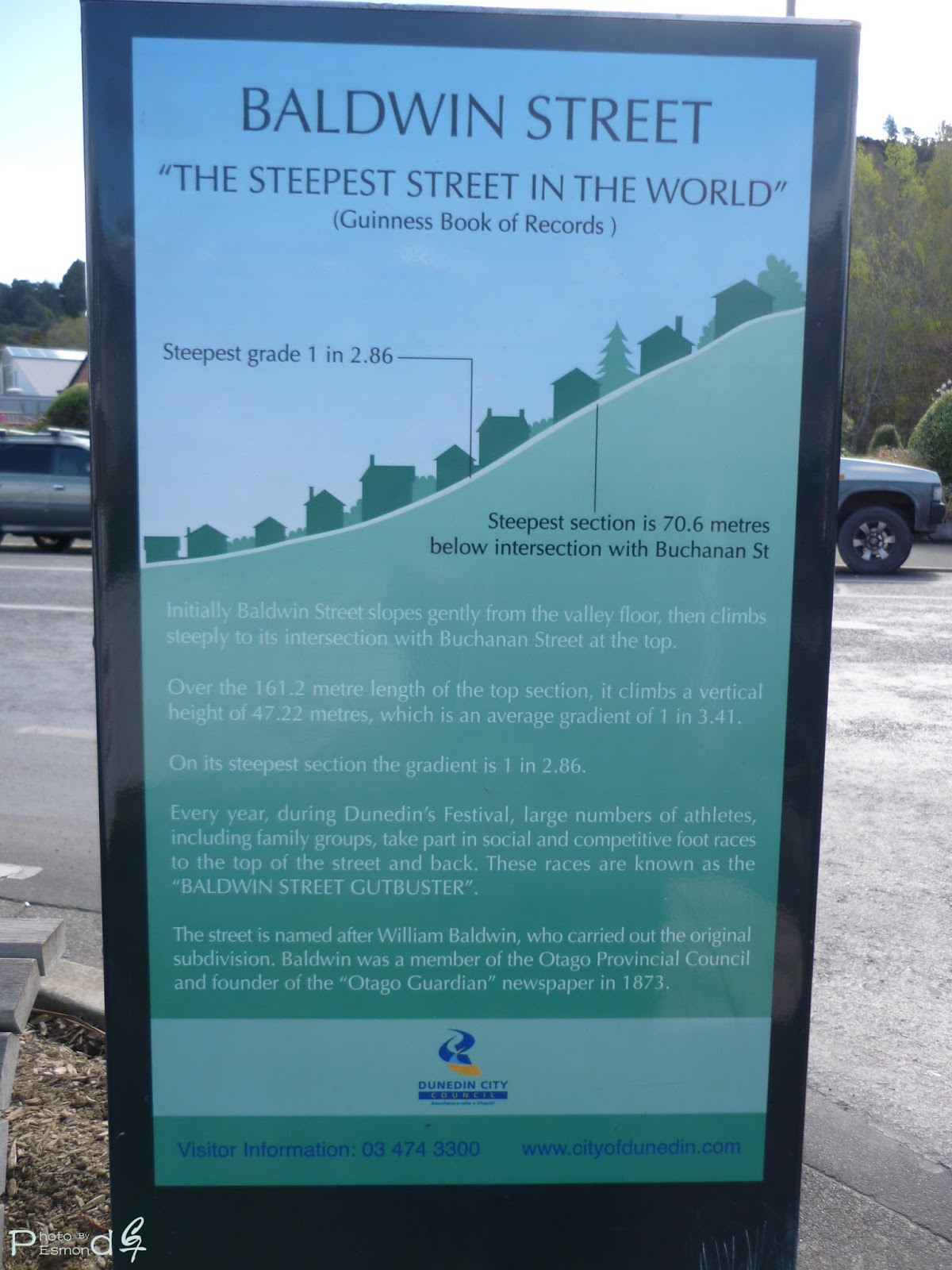 Dunedin除了有着许多保存良好的旧式建筑物,这里也有一个很好玩的旅游景点。这个景点不是一间建筑物,它只是一条街道,但是它的名声却是闻名海外、享誉全球。没有为什么,就只是因为这是世界上最陡的街道--Baldwin Street,这可是记录在Guinness Book of World Records的记录哦!!!