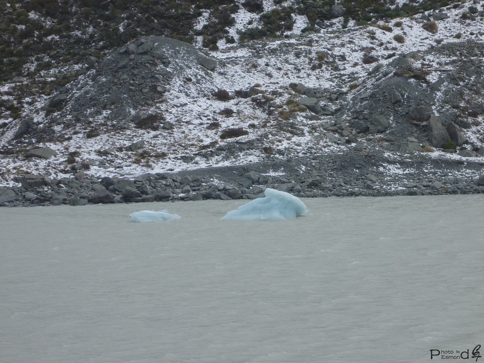 过了第二座吊桥,我们就继续望着远处的Mount Cook前进。走没多久,我们就来到步道的尽头啦,一个大湖。这个湖面上竟然还有浮冰哦,感觉这个湖应该还蛮冷的。。。由于这里的风蛮大的,我们稍微的停留一阵子就开始往回走了。