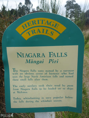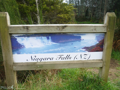在路途中,我们看到有路牌显示有一个瀑布--Niagara Falls。哇,没想到纽西兰也有一个叫Niagara Falls的瀑布哦!!!我们就沿着路牌指示去找找看看。几经辛苦,我们终于看到这个也叫Niagara Falls的瀑布了。。。眼前这个小小的水流瀑布也叫Niagara Falls???原来只是一个看过真正Niagara Falls的测量师幽默的为这个小小瀑布起的名字。。。这算是纽西兰式的幽默吗???