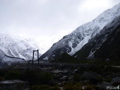 就这样的一路走一路拍照,渐渐的我们就走到接近第二座吊桥。这时候,从步道远远就看到那座闻名已久的纽西兰最高山--Mount Cook啦!!!由于在山的那一边的天气真的很多云,我还真的没有啥机会可以看到清楚的Mount Cook顶峰。。。