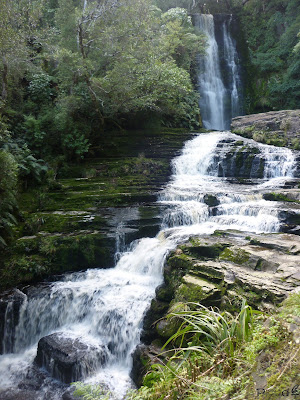过了这个小小的瀑布,我们终于去到另一个真正瀑布的景点--McLean Falls。这个瀑布从停车场沿着步道走进去大概需要20分钟,不会很难走,算是很容易抵达的瀑布了。在接近终点前会先看到一个小瀑布,这个小瀑布再小也比之前的那个Niagara Falls大许多。真正的好戏可在后头哦,终点的瀑布才真的是一个壮观的景色呢!这个瀑布在纽西兰众多瀑布中,虽然不是最壮观的、也不是最出名的,但却是我最喜欢的一个,我喜欢这个瀑布和周围环境形成的画面。
