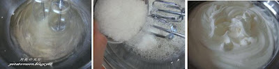 2。B料蛋白和塔塔粉打起泡,分两次加入糖 ,打硬
