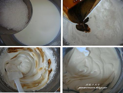 3。将植物性鲜奶油打至松发,加入班兰混合料拌匀,倒入容器里,放入冰格冷藏隔夜即可。 |