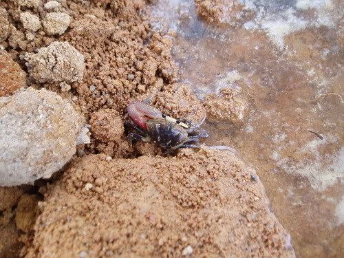 海水涨潮时来了一位不速之客,平时住在河岸的小螃蟹,今天跟着海水大涨时跑到陆地上来了。