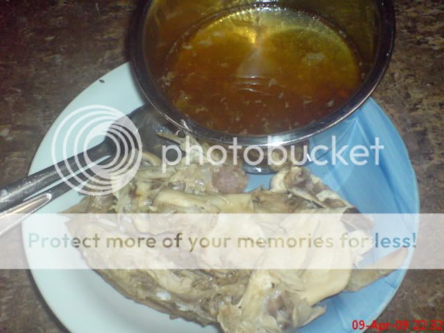 非常简单的,KAMPUNG鸡一定要剥掉皮,将整只鸡都舂碎掉,我用一个有盖的大碗,加入枸子和泡篸(你可以去药材店问看,不同的补法要放不同的药材的)加一点点的水(我加一汤匙,目的不要药材在开始时干干的)再用一个比较小的碗倒盖在大碗里,将鸡肉都放在碗上面,放进锅里炖3-4小时就可以了. |