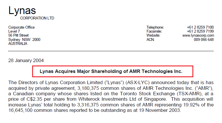 Akibat pengambilalihan yang tidak menepati undang-undang pengambilalihan saham di Kanada dan disebabkan Lynas menggunakan cara yang tidak professional untuk melaksanakan pembelian saham-saham AMR, maka pada February 2005 pengarah-pengarah AMR telah memfailkan saman di mahkhamah untuk menyaman Lynas atas tindakan mereka. Saman ini juga untuk halang mana-mana individu dari Lynas dari jadi pengarah di AMR Technologies Inc, dan mengundi sebagai pemegang saham semasa Mesyuarat Agung Tahunan. |