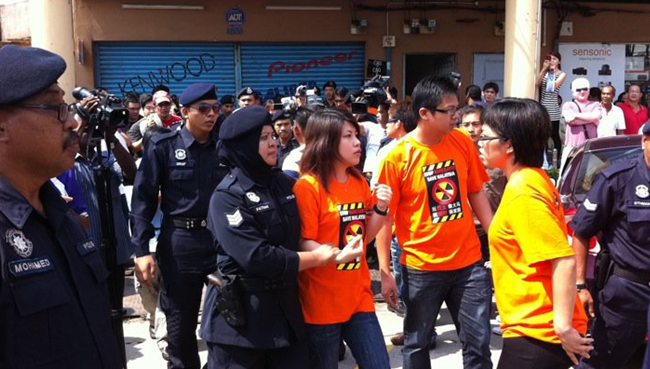 Ketika gambar diambil, OCPD mengarahkan mereka bersurai dan ketika itulah empat orang aktivis itu terbabit ditahan. Mereka digertak untuk ditahan hanya kerana bergambar sambil meniarap di atas kain rentang berlogo "radioaktif". Keempat mereka telah dikejar oleh pihak polis sehingga terpaksa melarikan diri ke dalam pejabat DAP. Namun, mereka akhirnya ditangkap dan dibawa ke Ibu Pejabat Polis Daerah Kuantan atas arahan OCPD Kuantan sendiri. Laungan "Hidup Rakyat, Stop Lynas" sekali lagi bergema ketika kenderaan yang membawa mereka beredar. Beberapa orang pimpinan Pakatan Rakyat termasuk YB Leong Ngah Ngah (ADUN Triang), YB Azan Ismail (Ahli Parlimen Indera Mahkota), YB Teo Nie Ching (Ahli Parlimen Serdang), YB Cheong Siew Onn (ADUN Teras) dan yang lainnya. Mereka yang berhimpun di perkarangan IPD Kuantan kemudianya diarahkan bersurai oleh pihak polis. Sementara itu di Pusat Khidmat DAP, pula Pengerusi PKR Pahang Dato' Fauzi Abd Rahman dikatakan berang dengan tindakan pihak polis itu. Ini katanya perhimpunan yang diadakan adalah secara aman dan tidak ada sebarang provokasi dan kekerasan oleh peserta. Makanya beliau mempersoalkan tindakan polis tersebut. Alasan permit adalah tidak masuk akal kerana himpunan itu diadakan di premis sendiri dan bukannya dalam tempoh yang lama sebenarnya. Ini menunjukkan polis sepatutnya lebih bertimbangrasa dalam menangani perhimpunan aman seperti ini.
