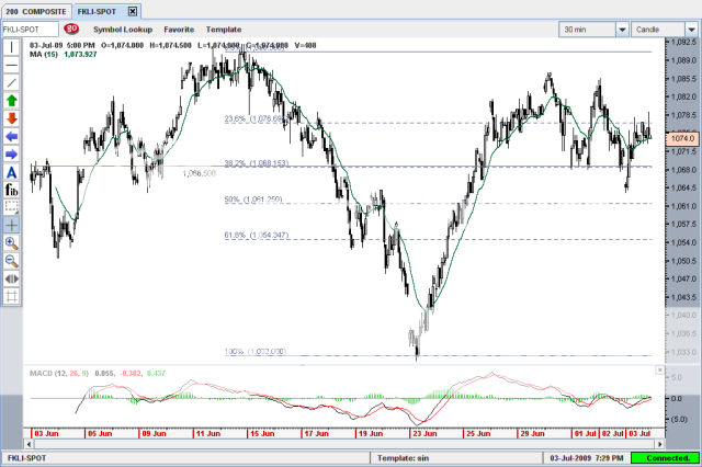 今早被Downjone影响开底,但到了大概十点就突破1068阻力到1076.5也遇到阻力...因横摆趋势15MA和MACD这几天发挥不到作用很容易被破坏...星期一如果下降到1068就出现三角形或突破1076就是W底..现在没有方向感在横摆趋势,突破就向上跌破就向下.... |