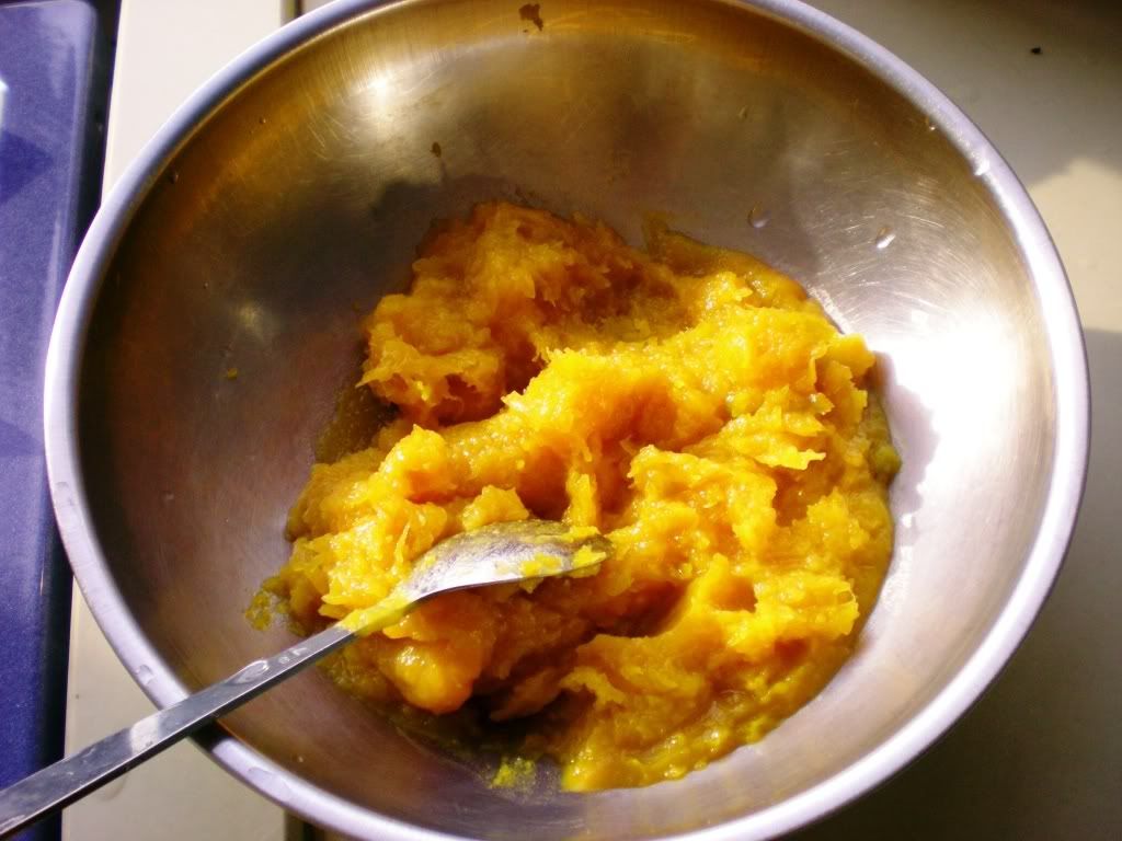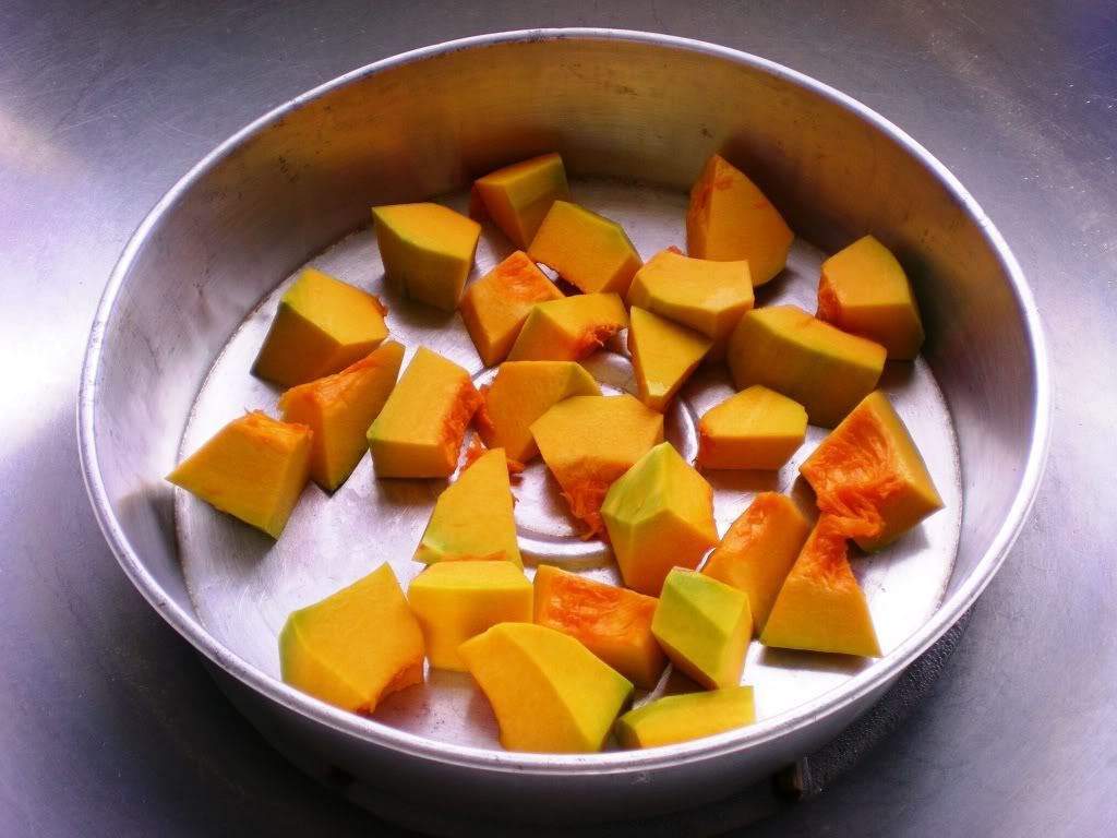 2.  南瓜切块, 用大火蒸熟 (大概10-15分钟), 然后捣成泥状(待用).