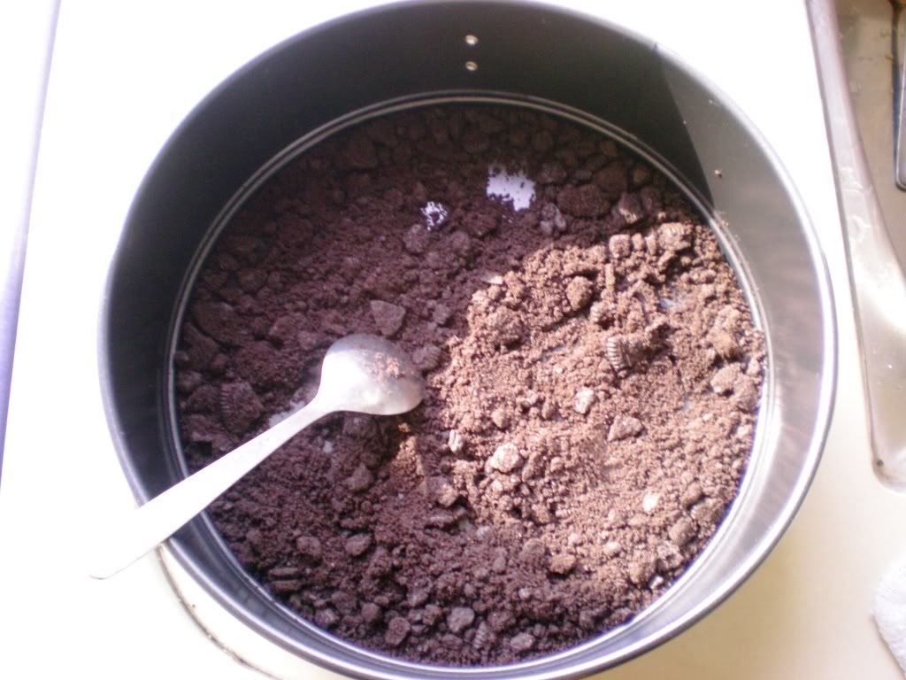 1.  将Oreo饼的内陷去除, 捣碎. 加入50g牛油和匀并将饼碎压实. 用摄氏160度烘10分钟.
