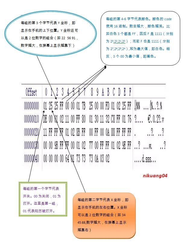 要修改按红色键(挂机键)后出现的资料,首先用WinHex打开date.cfg,以下的东西会出现。以下数码是6个一组的。详细说明(看PP_date配置文件的说明):