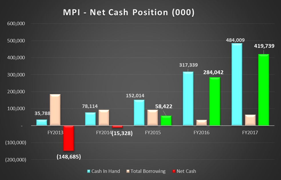 MPI现在手持的现金高达人吗RM484 mil,扣除Borrowing的话,Net Cash Position高达RM419.739 mil。