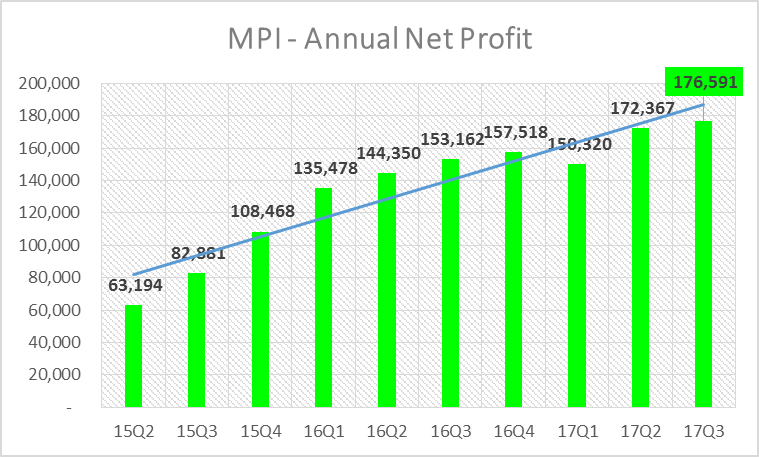 MPI在2017年4个月内上涨了55%以上,因此公司现在需要时间赚更多钱让股价成长。不过管理层非常乐观,表示未来几个季度都会交出满意的业绩,因此预计MPI的营业额以及盈利可以保持着稳定的成长。