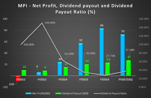 由于公司的Net Cash以及盈利都是近年的新高,所以这次的派息从去年同期的15仙进步到19仙。全年派息从23分进步到27分,其实笔者觉得MPI应该派发30分以上的股息回馈股东,他们的现金真的太多了。