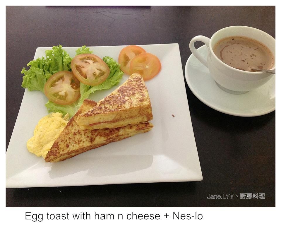2。打散一粒鸡蛋,将夹着火腿芝士的面包全面沾上鸡蛋液。