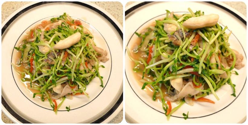 第三道 -- 咸鱼豆苗草菇 最后一道菜就是我最爱的蔬菜之一豆苗和草菇啦!炒法亦是很简单,将剩下的蒜米,生姜和咸鱼一起炒香,放入草菇炒,接着就是将豆苗放入一起炒,淋上些许蚝油,快速炒了一会儿,就可以把火关上,将锅盖盖上焖着一会,充满咸鱼香味的清新豆苗草菇是搭配白饭的最佳菜肴啦! 看看我们的晚餐是不是很诱人呢!快来也加入我们的行列,和心爱的人一起共享厨房乐吧!