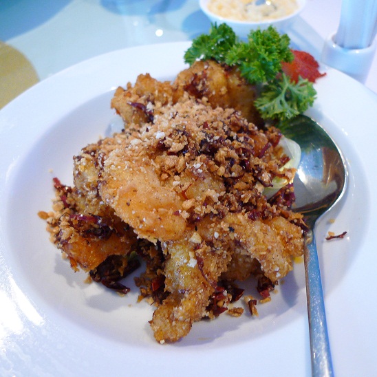 以辣椒干和蒜米等的香料掺着一起炸的虾球,口感吃起来超Q的。咸和甜的口味同时在嘴里化开来时,实属味蕾上的享受啊!