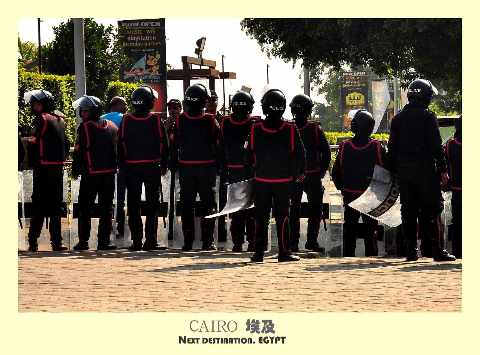 就在我踏出餐厅时,被眼前一字排开的镇暴警察给吓了一跳。但是我还是很快的拿出相机拍了一张照。我问到导游这是怎么一回事,没想到他耸了耸肩,告诉我说,星期五埃及回教徒祷告后,很有可能会发生示威活动,所以警察才不得不防备。想当年,埃及的茉莉花革命就是在星期五祷告过后发生。
