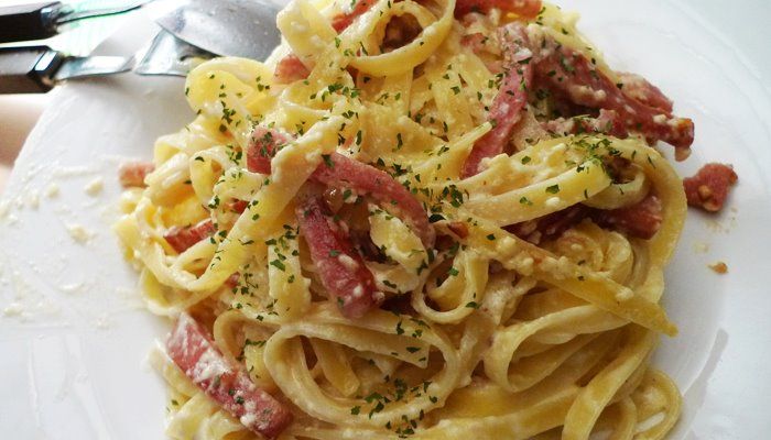 因此就随意做个午餐肉fettucine carbonara当晚餐。