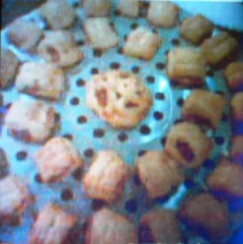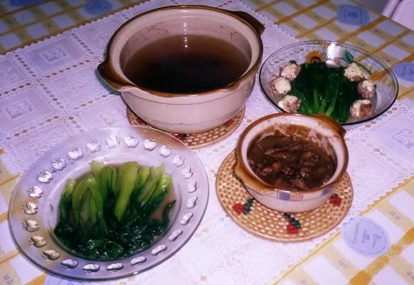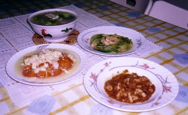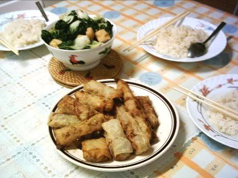 前天的晚餐:菜油饭、小白菜炒豆腐干及蔬菜猪肉卷。