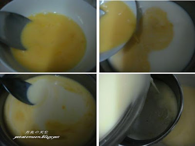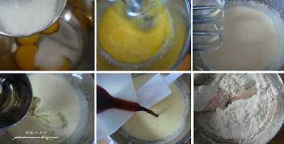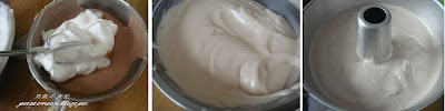 3.先加入1/3蛋白霜到麵糊中,橡皮括刀輕輕的用切拌方式攪拌均勻後再加入剩下的蛋白霜以相同方式攪拌均勻