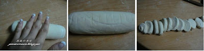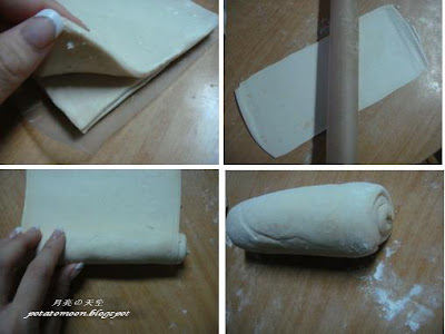 9.休息好的麵團表面灑些面粉避免沾粘,杆成圆形