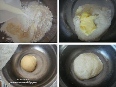 材料:馬鈴薯泥100g。高筋麵粉250g。速發酵母3/4茶匙。鹽1/4茶匙。細砂糖20g。鮮奶100g。奶油20g