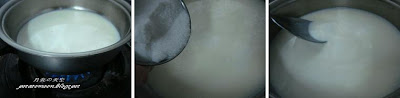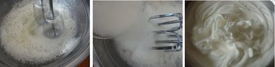 2.將蛋白用打蛋器打成慕斯狀挺立之蛋白霜