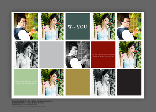 sharon,老实说我觉得他们的设计太随便了。。感觉很敷衍。从第1页到最后1页的设计都是框框的。。你的照片本身很美。。加了设计反而没有增加美感。叫他们做简单的设计和排版吧!如果不行就不要设计了。我觉得单张更好看。 |