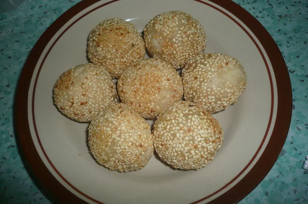 4。将皮包上花生馅槎成圆团再滚上白芝麻。
