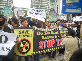 KUALA LUMPUR, [size=85%]20 Mei - Ratusan orang berhimpun bagi membantah pembinaan pusat pemprosesan nadir bumi bernilai RM700 juta di Gebeng, Kuantan yang dimiliki syarikat Lynas yang berpengkalan di Australia. Mereka yang terdiri daripada anggota Pemuda PAS, PKR, Parti Sosialis Malaysia (PSM), NGO dan aktivis sosial itu mengadakan perhimpunan di hadapan Pesuruhjaya Tinggi Australia di Kuala Lumpur. Sambil mengiringi enam wakil mereka untuk menghantar memorandum bantahan berhubung pembinaan pusat itu yang dikatakan akan mengeluarkan bahan radioaktif yang boleh menjejaskan kesihatan penduduk sekitar Gebeng di negeri itu. Mereka juga membawa pelbagai sepanduk, poster dan kain rentang yang menuntut kerajaan supaya segera menghentikan projek berkenaan. Ia antaranya bertulis "Selamatkan Bumi, Hapuskan Radiasi" dan "Katakan tidak Pada Radiasi! Hentikan Lynas!". Penunjuk perasaan mula berkumpul di Masjid As Syakirin KLCC sebelum berarak menuju ke Pejabat Pesuruhjaya Tinggi Australia yang terletak kira-kira 700 meter dari selepas solat Jumaat. Sewaktu tiba di pada jam 2.15 petang mereka turut melaungkan "Hancur Lynas, Hidup Rakyat" berulang kali. Mereka kemudiannya disertai oleh ahli parlimen Kuantan, Fuziah Salleh, empat wakil NGO dan aktivis sosial sebelum memasuki perkarangan pejabat tersebut. Turut hadir ketua Pemuda PAS Nasrudin Hassan, Naib Presiden PKR, Tian Chua, Naib Ketua AMK PKR Azmizam Zamanhuri, Setiausaha Agung PSM S Arutchelvan dan exco Kerajaan Selangor Rodziah Ismail dan Elizabeth Wong. Sejurus mereka masuk, hujan turun dengan lebatnya, tetapi penyokong anti-Lynas tidak berganjak dan terus berhimpun sambil menyanyikan 'Suara Rakyat' dan bertakbir.