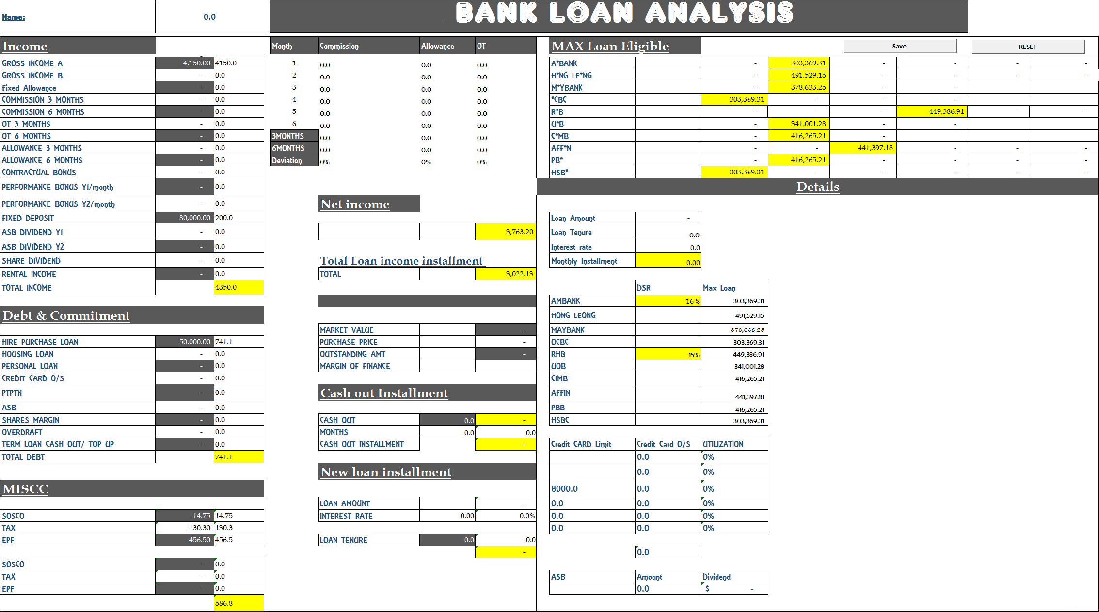| 1. Based on the details given by you, Your max loan eligibility for each bank is as follow: | | | Rm | | A*BANK | 303,369.31 | | H*NG LE*NG | 491,529.15 | | M*YBANK | 378,633.25 | | *CBC | 303,369.31 | | R*B | 449,386.91 | | U*B | 341,001.28 | | C*MB | 416,265.21 | | AFF*N | 441,397.18 |