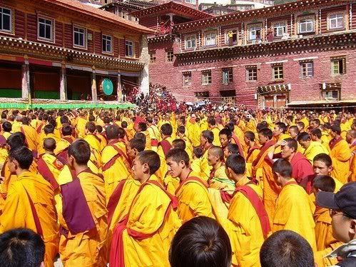 (4)藏曆六月,為紀念「蓮花生大士」而舉行盛大的「蓮師誕辰大法會」:修持龍薩寧波伏藏《上師蓮花光明》及《紅觀音》各十天、德達林巴伏藏《紅觀音》十天、敦都多傑伏藏《九面十八臂普巴金剛》十天、加雄倡伏藏《黑色文殊手印制伏大威德》十天、咕嚕卻旺伏藏《上師密集》兩天,以上本尊修法同時進行;再來舉行《蓮師八變》、《文殊大威德》、《上師密集》金剛舞三天,最後給予龍薩寧波伏藏《蓮花光明》灌頂一天。