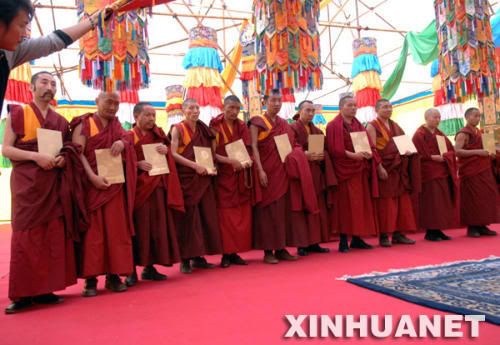 10月18日,学员加样洛桑(右)和坚参群培在观看被授予的“拓然巴”高级学衔证书。