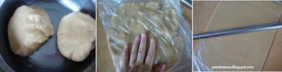 5.將麵團分成2團分別放入塑膠袋中,用手稍微壓扁,再用橄麵棍桿開成為一張厚約0.4mm的麵皮 (將塑膠袋前端開口處折起,這樣麵團在封閉的塑膠袋中桿壓就可以桿的很整齊)