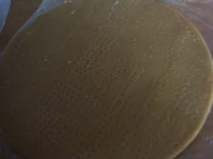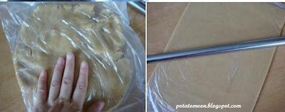 11.放入塑膠袋中再用桿麵棍桿壓成平整厚約0.4mm的麵皮