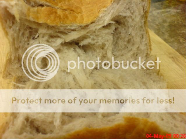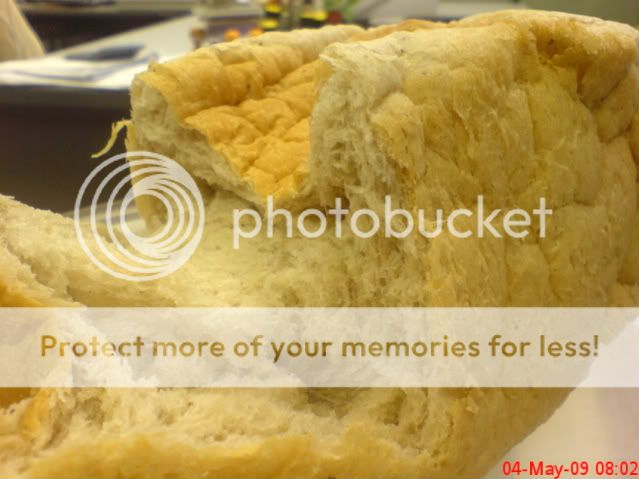 这是昨天做的烫种土司,自己加了BLUEBERRY 酱,好像上次miao miao一样,没有预期的颜色和味道(甚至完全没有它的味道呢)我在拌面团时看到面团好象很干,还特地加多了一些水,搅拌好面团,等它发酵好后,因为要出去,就将整个面团用PLASTIC袋装好放进了冰箱里,3个多小时回到家才把它杆好放进土司模烤的,非常软的土司,很难切,干脆就撕来吃了