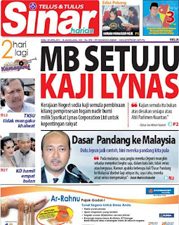 [Kepada mereka yang mempunyai bahan-bahan penting untuk dipaparkan ke dalam blog berkenaan. Agak menghairankan bila mana mereka yang tinggal di Kuantan dan sekitarnya masih belum faham atau ambil berat isu ini. Malah, peratusan orang Melayu yang peka kepada bahaya radiasi yang akan dikeluarkan oleh kilang tersebut amatlah rendah. Mungkin dek kerana media arus perdana berbahasa Melayu yang berterusan untuk menutup cerita sebenar tentang itu ini. Hanya Sinar Harian dan akhbar berbahasa Cina yang dilihat lebih peka dengan memaparkan isu sebegini. Lantaran itulah kita tidak hairan kaum Cina lebih ramai berjuang untuk menyelamatkan generasi akan datang dalam isu Lynas sebenarnya]. |