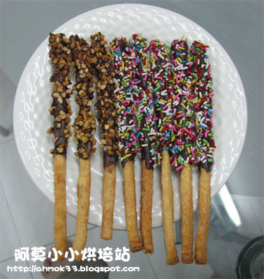 - 将(3)分成2份,沾上溶化巧克力后,一份黏满烤香杏仁碎,另外一份黏满七彩巧克力碎,待巧克力凝固即可收进密封罐子里。
