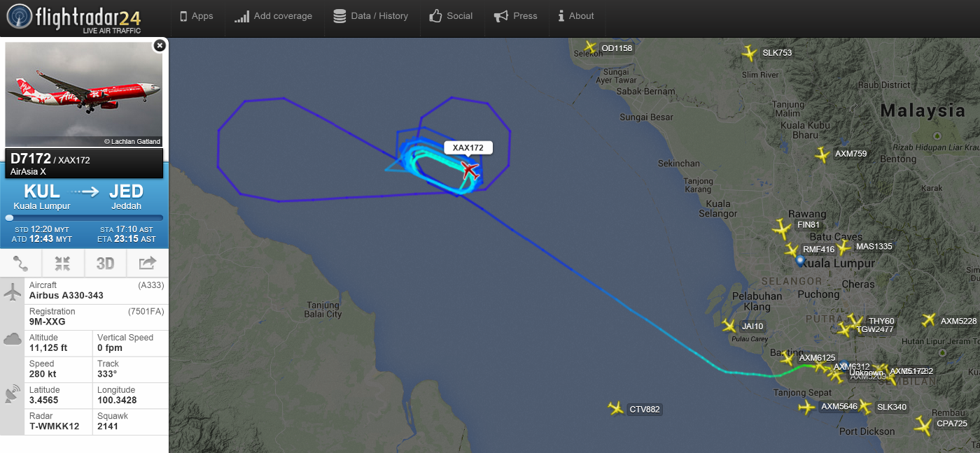 據飛機追縱網站flightradar24的數據顯示,這架A333型號的飛機中午1時20分從KLIA2出發不久,便在南中國海域上盤旋,不斷環繞飛行了逾4小時還無法降陸。