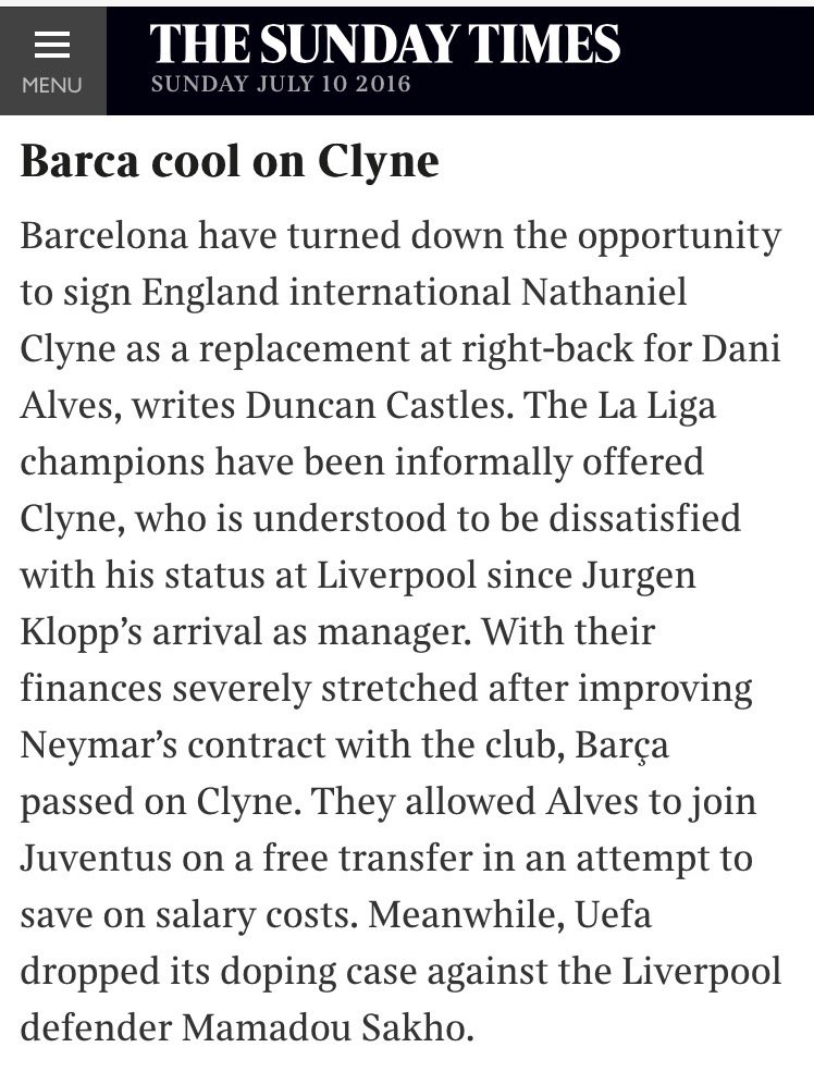 Barcelona were offered an opportunity to sign Clyne. [Times]