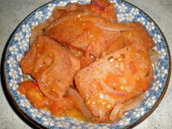 呵呵..我有點怕吃午餐肉, 覺得蠻咸的, 就嘗試煮些番茄汁, 企圖稀釋一點那個咸味~