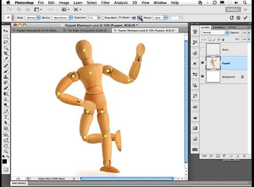 最新的 Photoshop CS5 功能称之为 Puppet Warp,可以在一张图片上实现人物局部移动变化。Puppet Warp 类似于 After Effects,但 After Effects 的用户群不如 Photoshop 来的多就是了。
