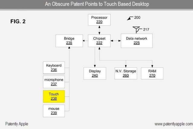 一项新近公布的专利申请显示,苹果可能仍有意开发触屏Mac。文档中的描述系统方案通过几种可能的输入途径,包括“键盘、麦克风、触屏输入以及鼠标输入”,与中控芯片组还有显示器、存储、网络等部件进行交互。苹果补充说明称,显示器可能采用DVI或HDMI接口,或外接至笔记本、“小型个人电脑”或智能手机。