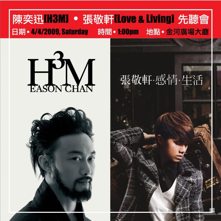 4月4日,下午1點,陳奕迅H3M,張敬軒Love & Living新專輯先聽會將會在金河廣場舉行。當天預購陳奕迅H3M專輯將隨專輯附送T-shirt一件,而預購張敬軒Love & Living專輯亦有機會贏取張敬軒[軒。動。魔法演唱會]入門票。除了可以觀賞MV,玩遊戲贏取陳奕迅,張敬軒周邊產品之外,陳奕迅,張敬軒也將會跟你空中會面!一定要準時赴約!