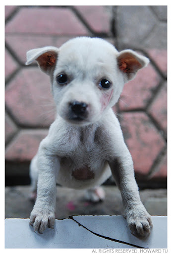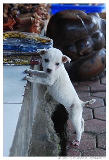 走著走著,跑出了兩只不足月的小狗,一黑一白,頓頓跌跌但活潑的追逐,真感開心之時,竟發現兩只小狗居然有皮膚病。好好的兩只小狗天生是賴皮狗。心疼之下和小白逗玩了兩下,怎知道小白非常親人,對我窮追不捨,我趕也不是,讓它粘也不是,一時好尷尬。後來忍心走上高一層店家的階級。小白還小,腳無力爬上。看著它無辜的眼神,有些心酸。