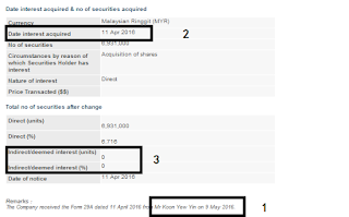 | Date interest acquired & no of securities acquired | Currency | Malaysian Ringgit (MYR) | Date interest acquired | 11 Apr 2016 | No of securities | 6,931,000 | Circumstances by reason of which Securities Holder has interest | Acquisition of shares | Nature of interest | Direct | Price Transacted ($$) |