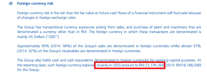 笔者计算到的美金资产(包括现金receivable)是34.2 mil,美金下跌了大约9%。 所以34.2 mil x 9% = 3.078 mil。而且当时还马币对比其他国家的货币也是走强的,所以其他国家Trade receivable预估也有0.18 mil左右的Foreign Currency translation losses。