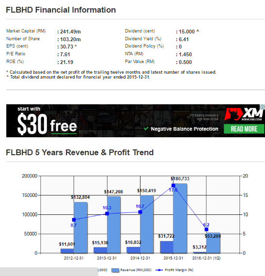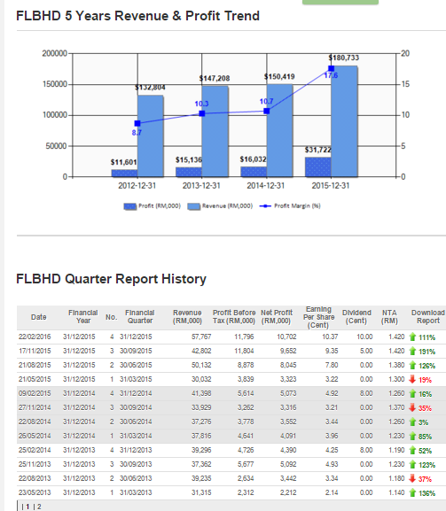 从上图我们可以看到,FLBHD的营业额以及盈利已经连续走高了4年。Profit Margin更是从8.7%上升至17.6%。而全年的EPS是30.74,以现在RM2.60的股价计算,PE大约是8.46。而且ROE更是进步到了21.65, 周息率大约是5.77%。